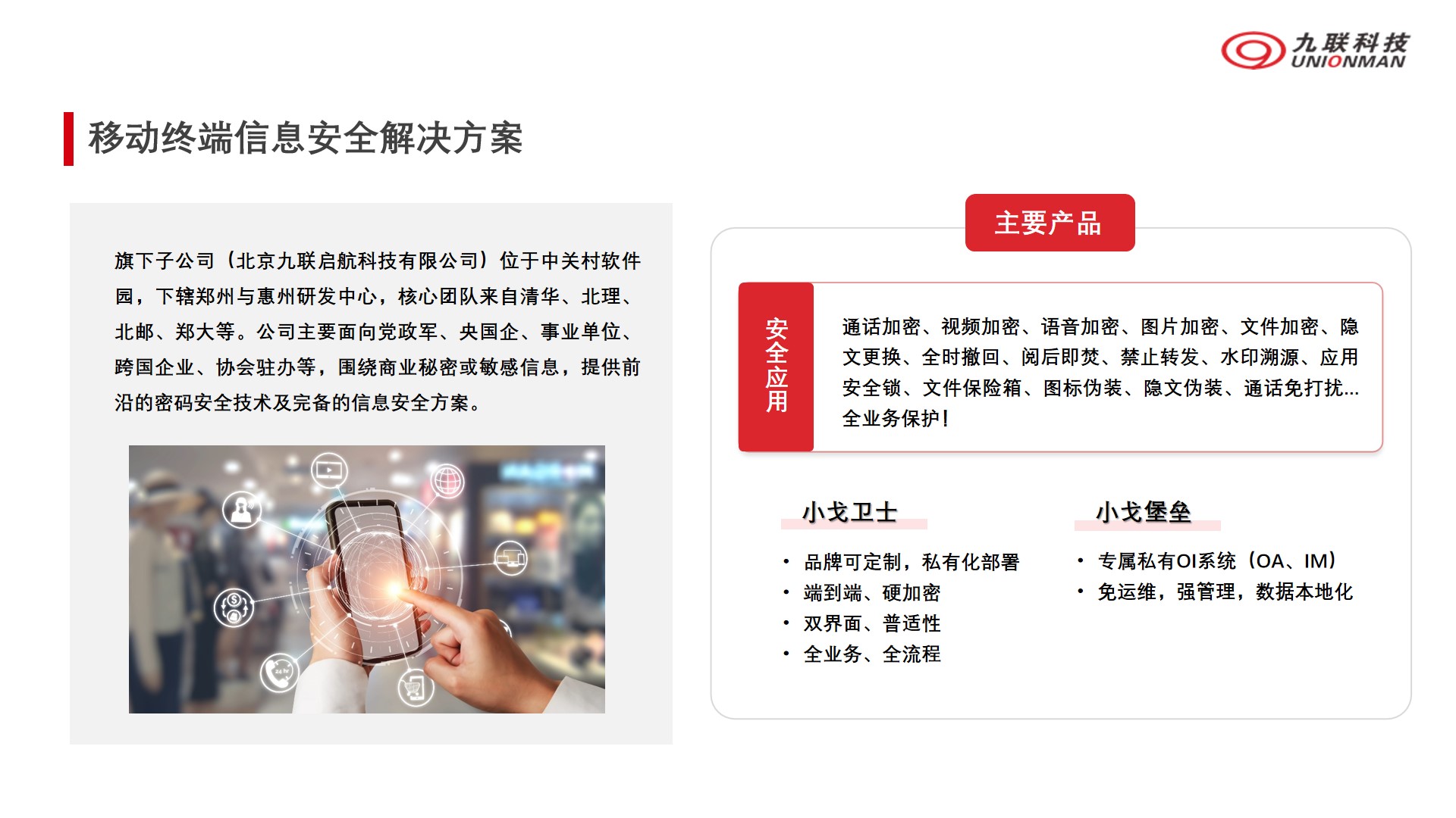 旗下子公司(北京云顶国际集团启航科技有限公司)位于中关村软件园,下辖郑州与惠州研发中心,核心团队来自清华、北理、北邮、郑大等。公司主要面向党政军、央国企、事业单位、跨国企业、协会驻办等,围绕商业秘密或敏感信息,提供前沿的密码安全技术及完备的信息安全方案。